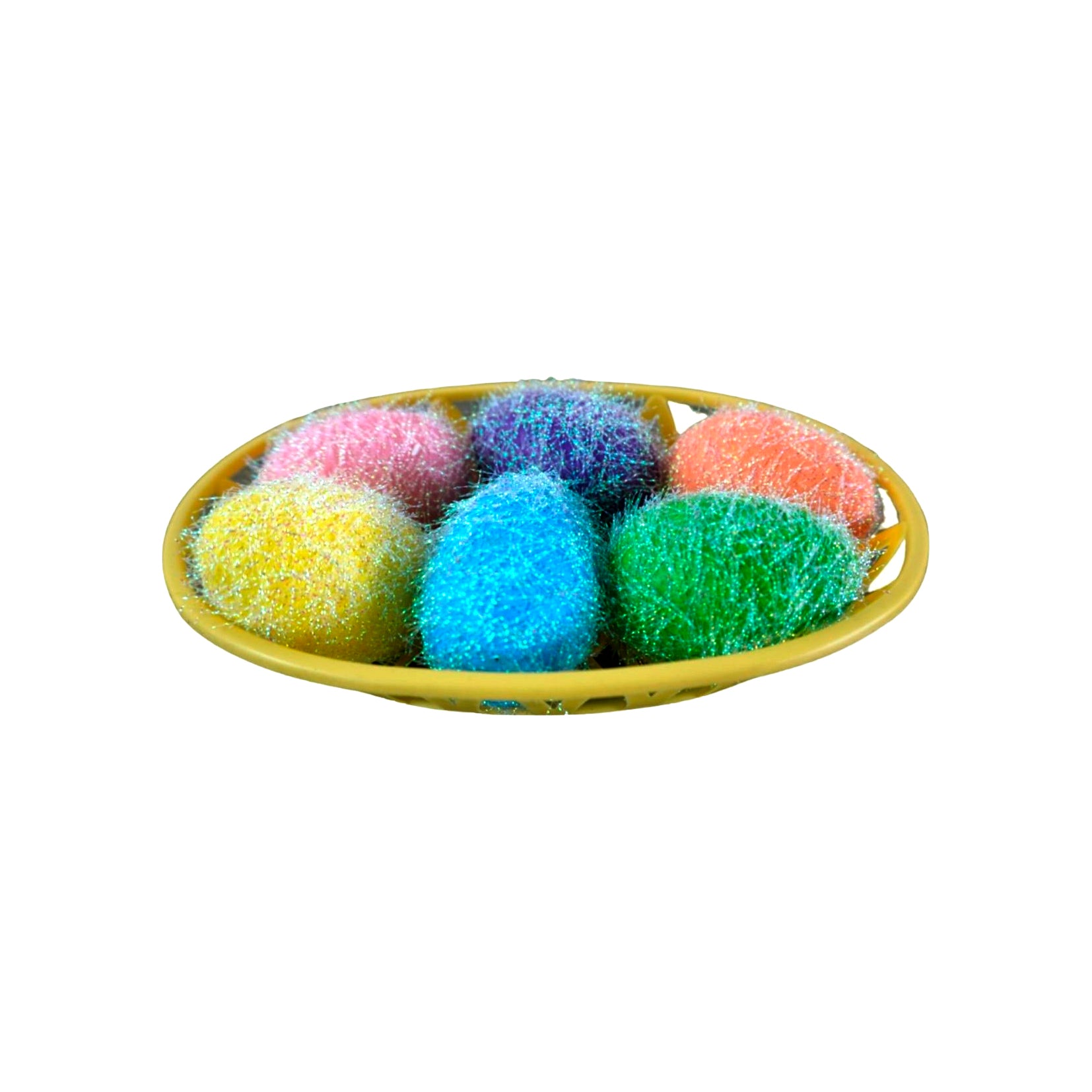 Canasta con 6 huevos de pascua con un acaba de peluche, cada huevo mide 5.5cm. variedad de colores