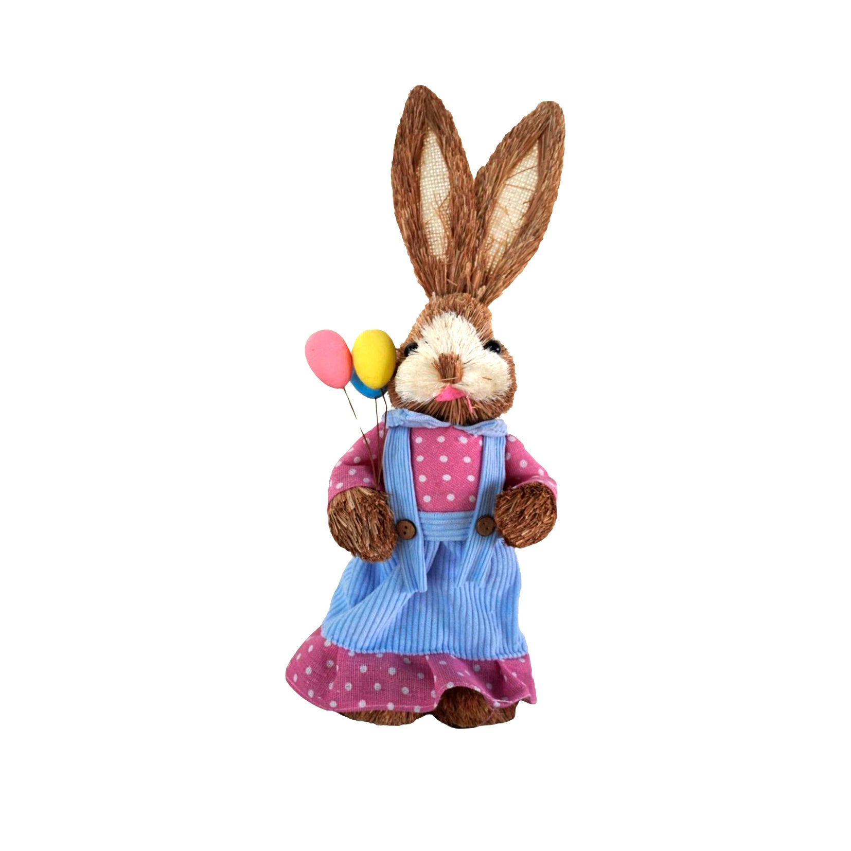 Coneja overol azul claro y camisa rosa, con globo en mano. 37cm de altura