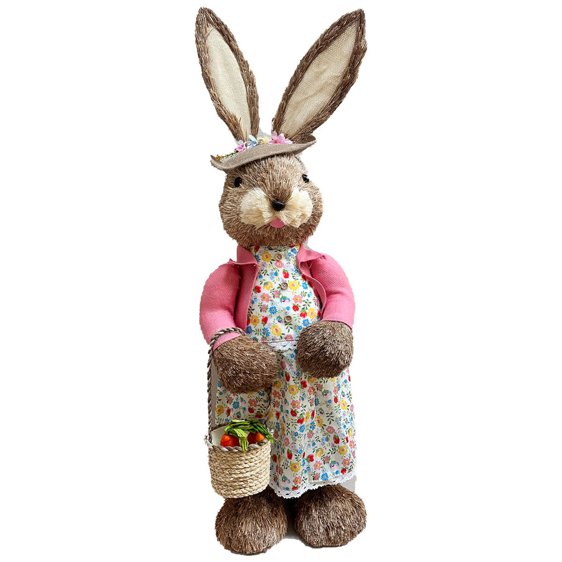 Coneja con sombrero de mimbre decorado con flores, vestido de flores, saco rosa y canasto con zanahorias. de 110cm de altura