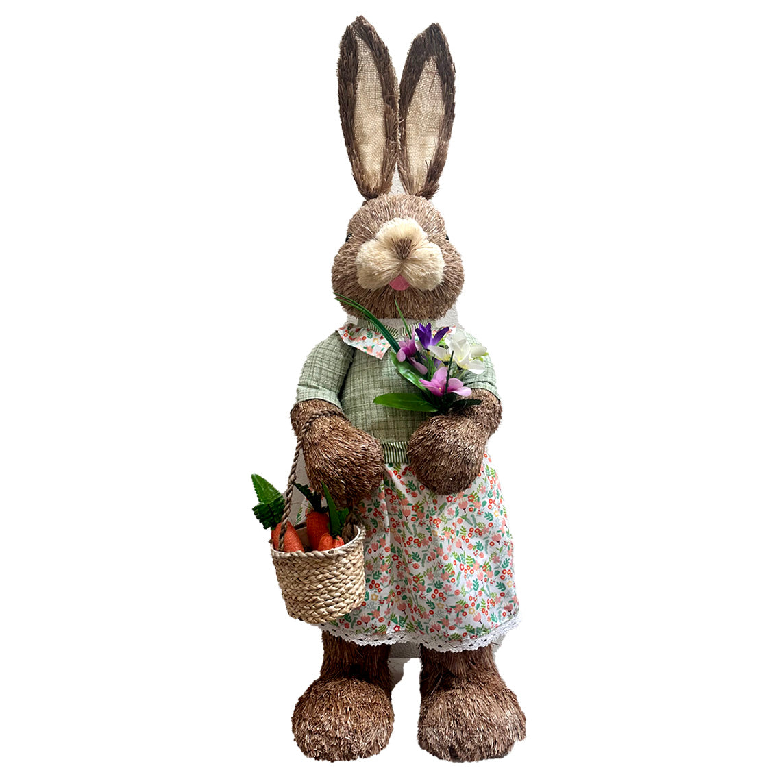 Coneja con vestido de flores , blusa verde, canasto con zanahoria y flores moradas en mano. 110cm de altura