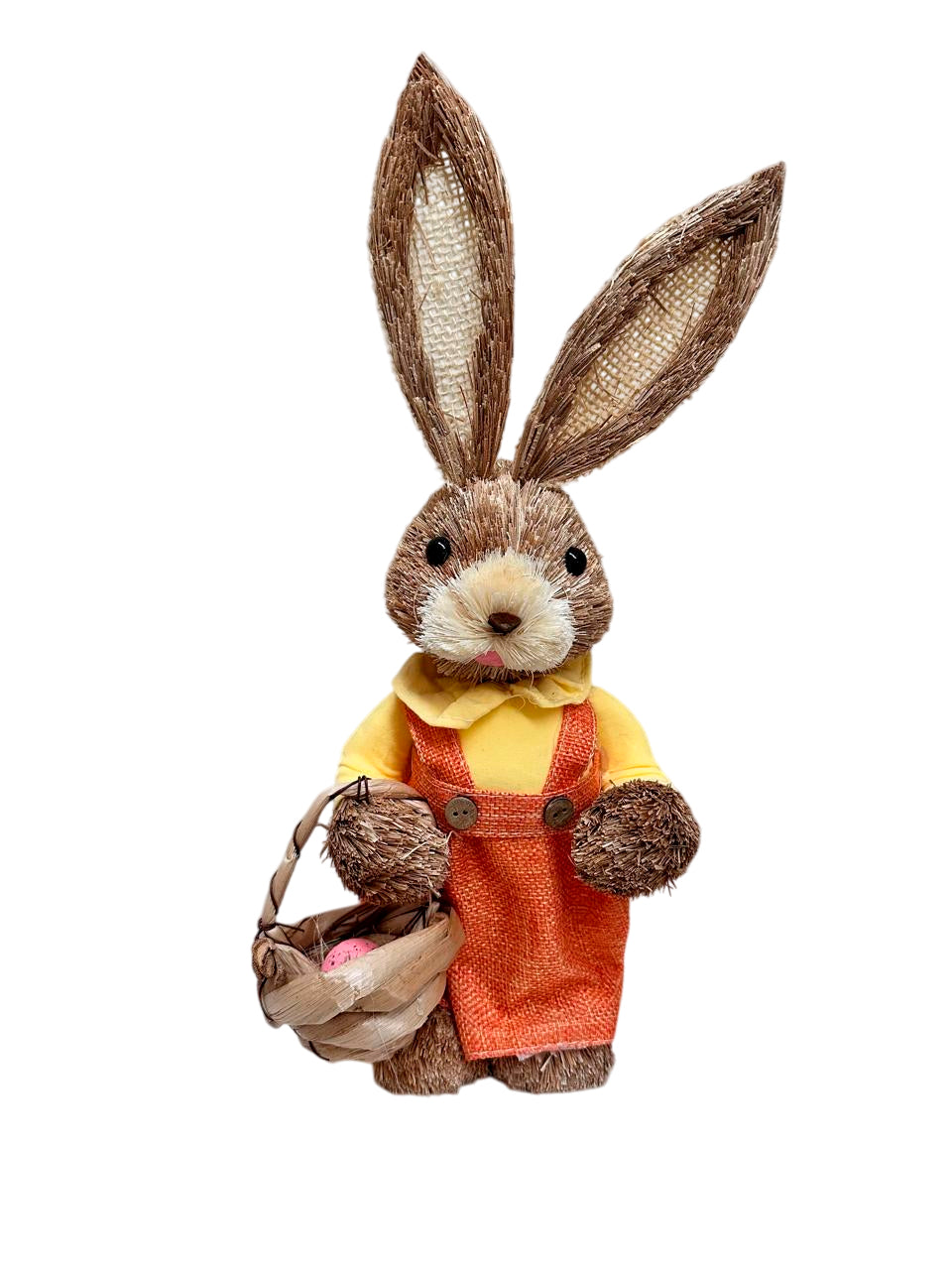 Agrega un toque encantador a tu decoración de Pascua con este adorable conejo artesanal, elaborado con paja natural. Vestido con ropa tejida a mano al estilo de una granja de cultivo y acompañado de accesorios encantadores, como una canasta y una zanahoria, este conejo es el complemento perfecto para cualquier hogar o espacio. Su diseño único y materiales naturales es ideal en la tradición de Pascua.