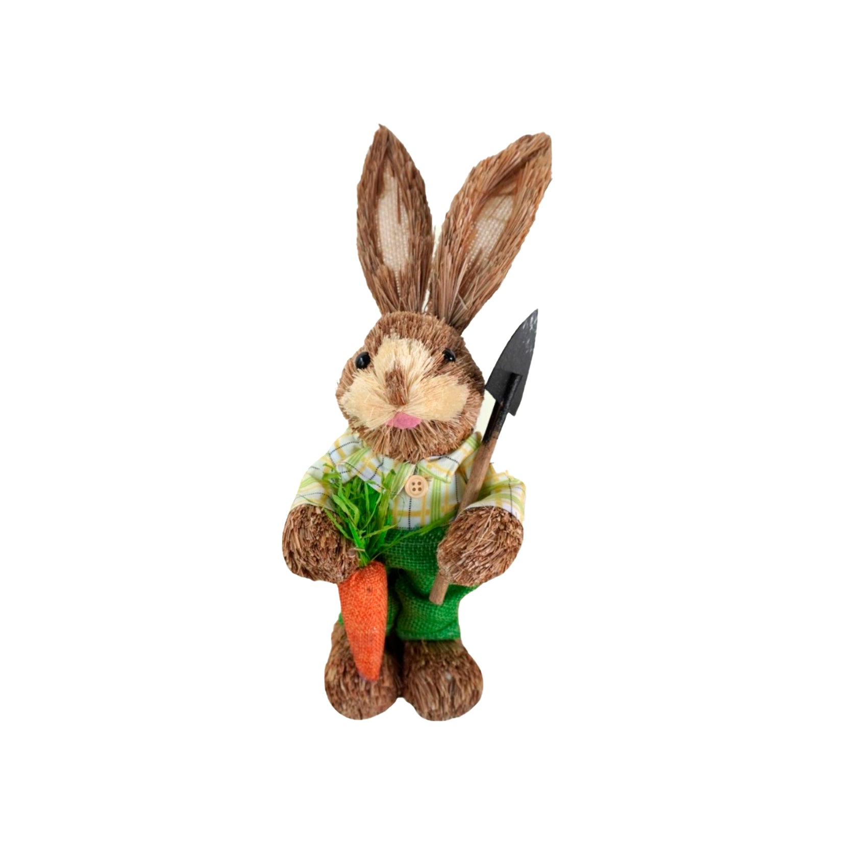 Conejo con camisa a verde a cuadros, pantalón verde. zanahoria y pala en mano. 37 cm de altura