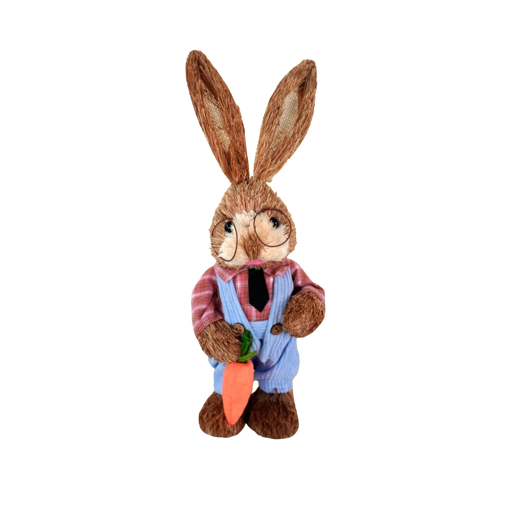 conejo con overol azul, camisa de cuadros y zanahoria en mano. 37cm de altura