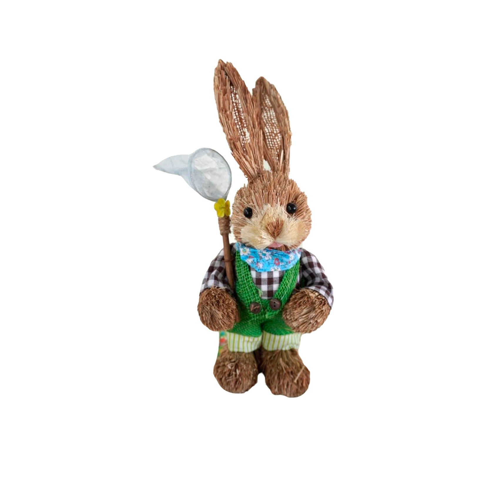 Conejo con camisa a cuadros negro, overol verde y pañoleta azul. red en mano. 37 cm de altura.