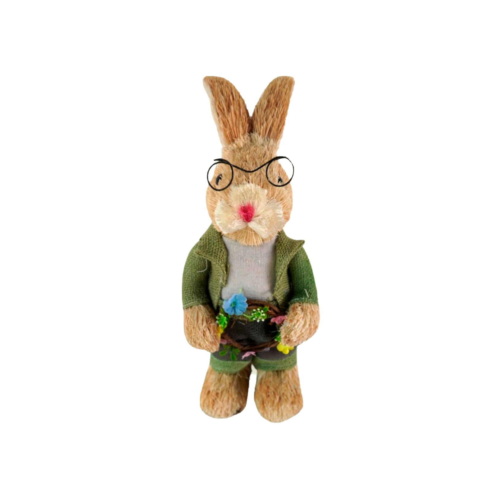 Conejo con pantalón gris y verde, suéter verde, playera blanca, corona de flores y lentes 42 cm de altura