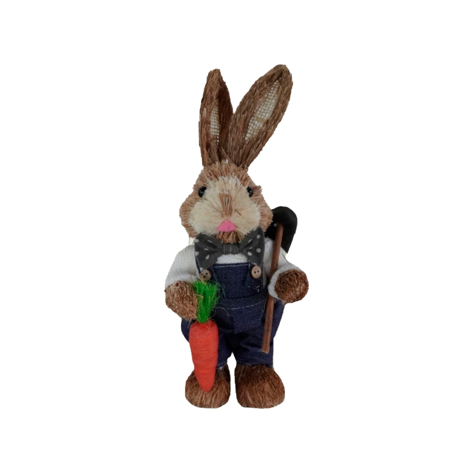 Conejo con overol azul marino, suéter blanco, moño gris con lunares, zanahoria y pico en mano 37 cm de altura